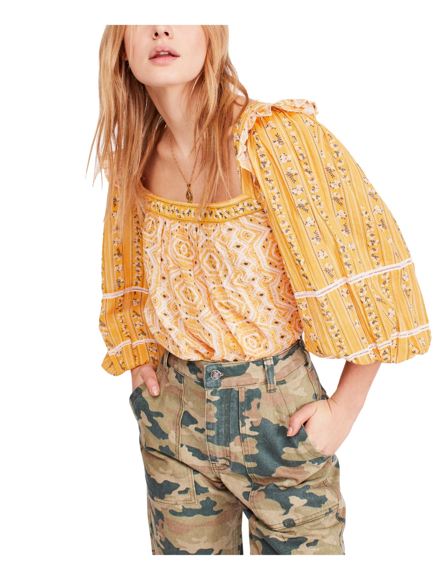 Free People Womens Yellow Printed Long Sleeve Square Neck Top Size M Walmart Com